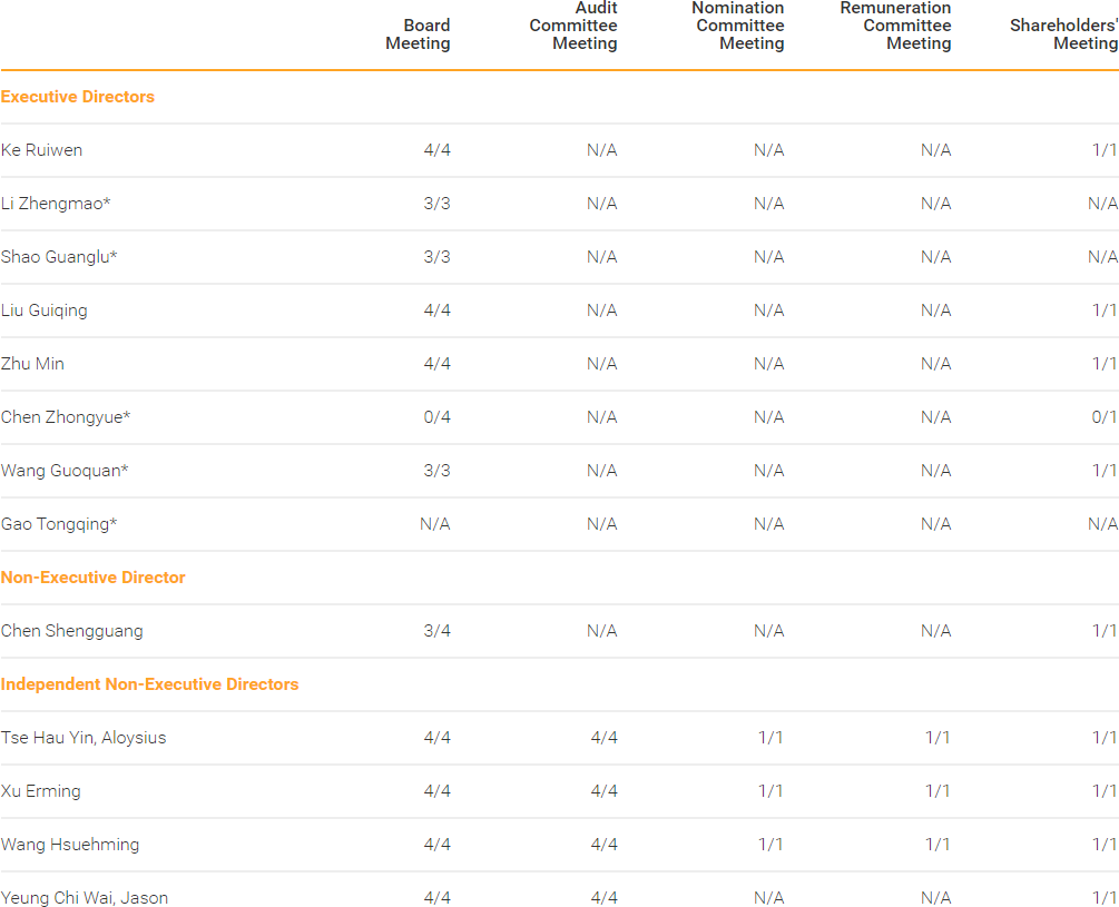 | * | On 17 January 2020, Mr. Gao Tongqing resigned from his positions as an Executive Director and Executive Vice President of the Company due to change in work arrangement. On 26 May 2020, Mr. Li Zhengmao and Mr. Shao Guanglu were appointed as Directors at the 2019 Annual General Meeting. On 4 December 2020, Mr. Wang Guoquan resigned from his positions as an Executive Director and Executive Vice President of the Company due to change in work arrangement. On 19 January 2021, Mr. Chen Zhongyue resigned from his positions as an Executive Director and Executive Vice President of the Company due to change in work arrangement. |