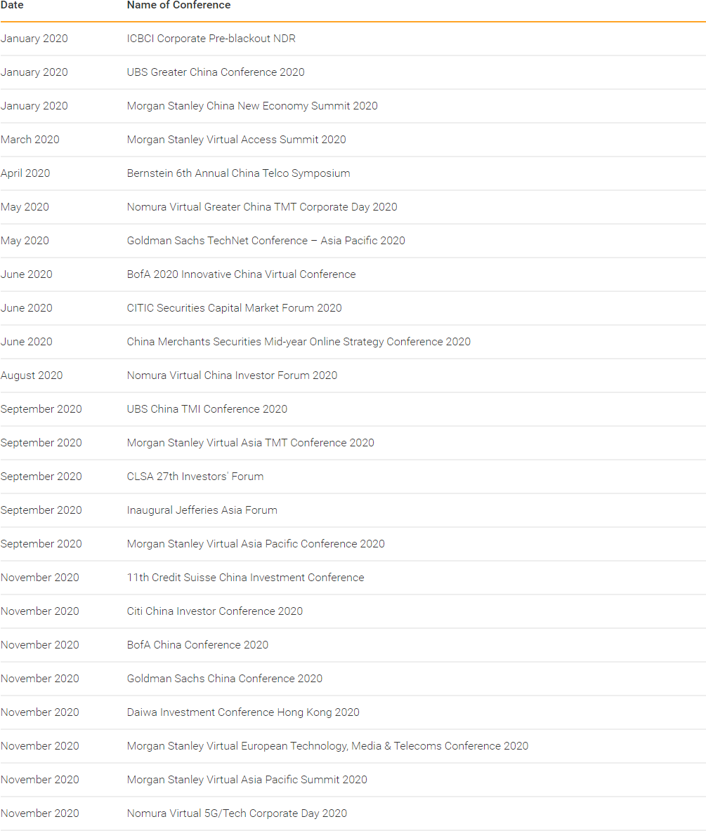 With an aim of strengthening communications with the capital market and enhancing transparency of information disclosure, the Company has provided quarterly disclosure of revenue, operating expenses, EBITDA, net profit figures and other key operational data, and monthly announcements of the number of access lines in service, mobile and wireline broadband subscribers. The Company attaches great importance to maintaining daily communication with shareholders, investors and analysts. In 2020, facing travel restriction brought by the COVID-19 Epidemic, the Company proactively participated in a number of investor conferences held by a number of major international investment banks around the globe through online meetings, which facilitated the communication with institutional investors.